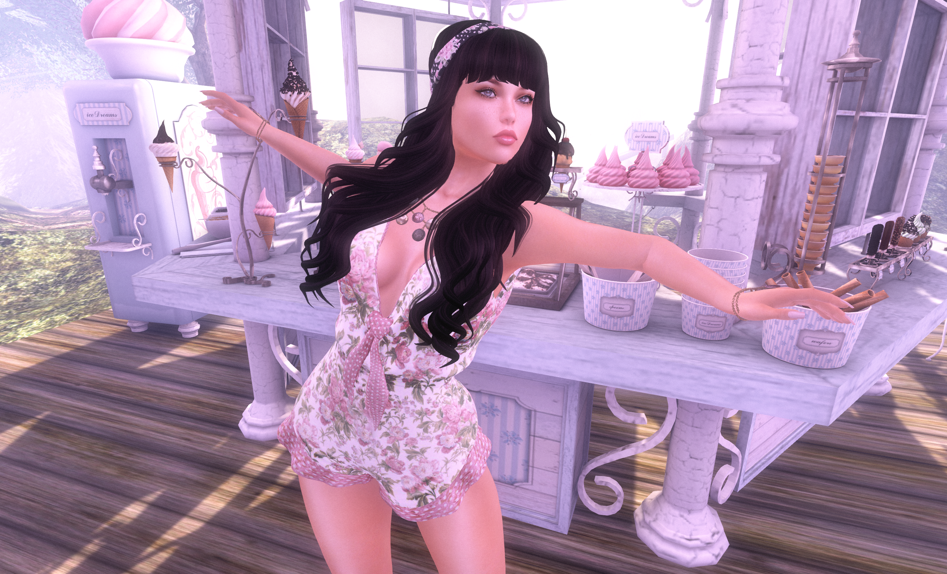 Cute outfit, cute hair….had to find a cute place for the photo so I headed over to MadPea Productions mainstore and sim. If you haven’t been there you really should take time out to hang out there. There is so much more there than just a mainstore. There is a history path featuring information of the 60 or so games that MadPea have produced in their 8 years on the grid. Some super little Artist huts, a playground, Greedy table, cafe and this beautiful ice cream store.