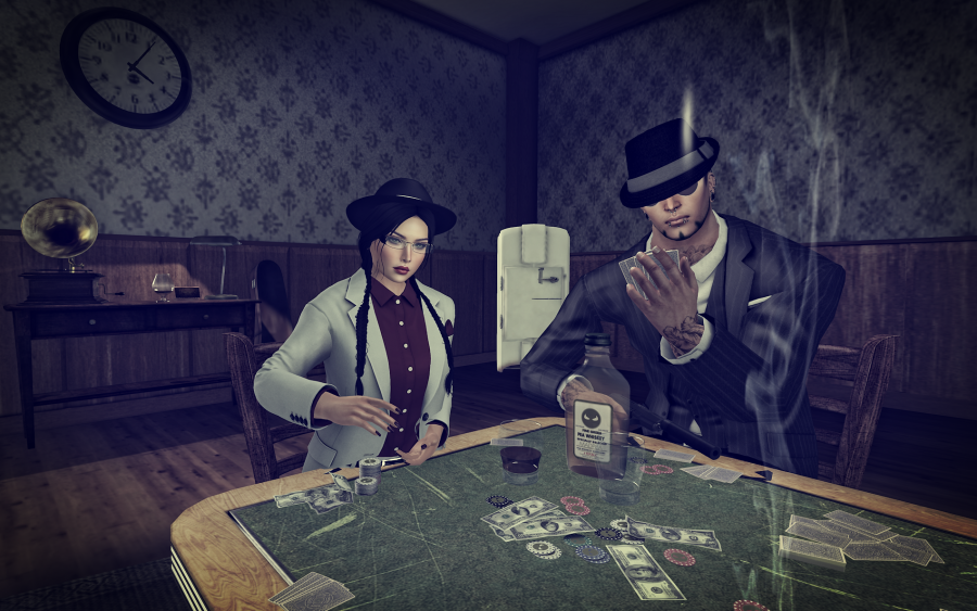MadPea Hoodlums’ Hideout Poker Table and Chairs RARE with custom made animations, poker chips, money and wearable cards.