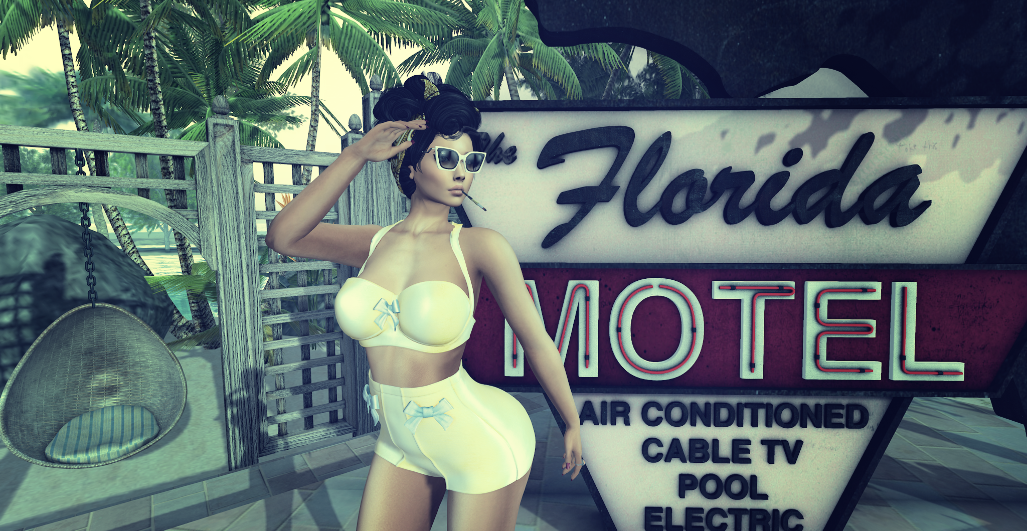 I’m loving the retro look of this bikini from Junbug at Summerfest. The tops and bottoms are sold separately so you can mix and match the many different colours and texture patterns and comes in Maitreya and both Slink fits. It’s unusual for me to stray away from my regular skin but I fell in love with the Pumec Emelie applier available at Tres Chic this month. I’m wearing it with Jessica and the absolute bonus is that Pumec include a skin applier for your mesh bodies in with the Catwa applier so you can match up your skin perfectly. The decor for in the background is mainly from Summerfest too. Seven Emporium’s Florida Motel Sign looks amazing on any retro sim and the Culprit Pod Chair adds to my poolside perfectly.