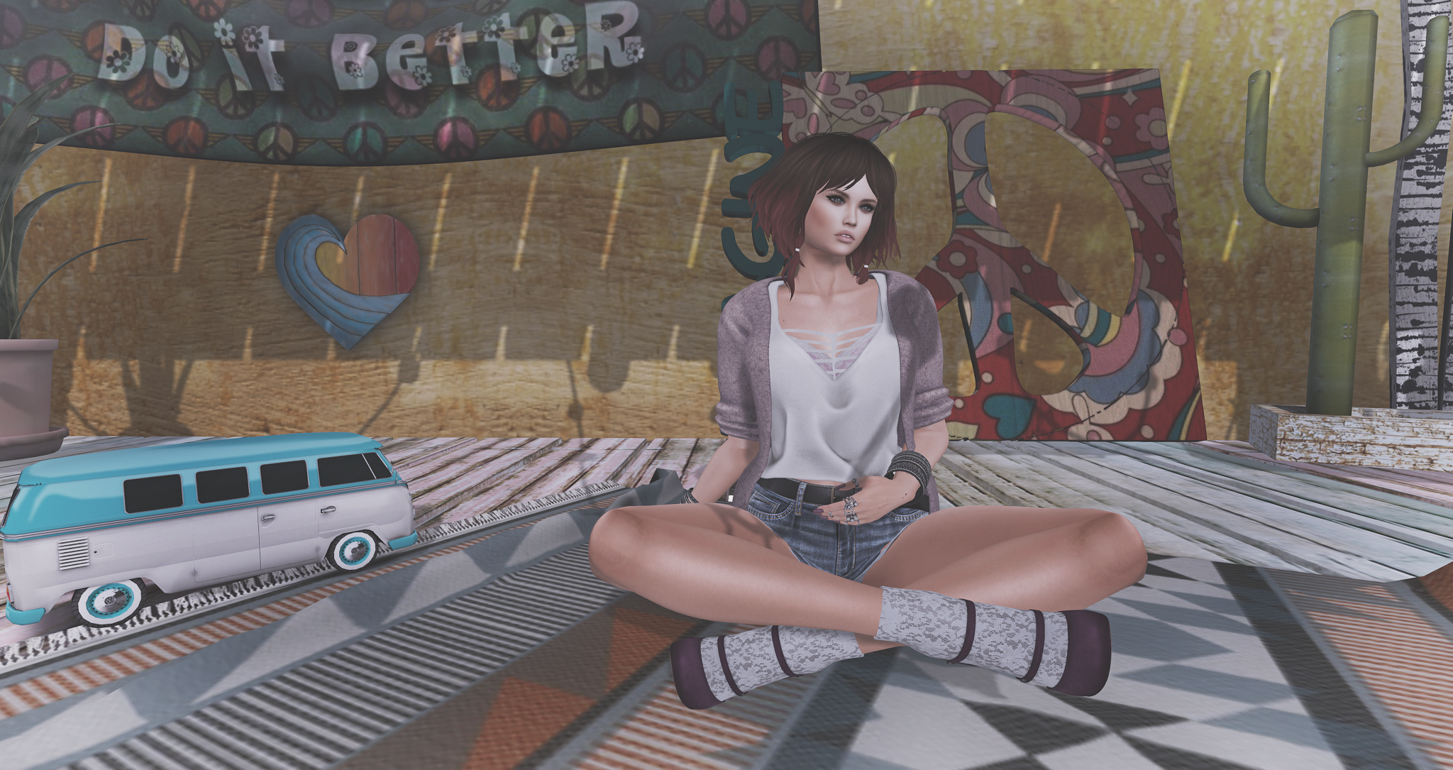 Well the sign behind me in this picture actually say Hippies do it better but I was thinking it could say a lot of different….it reminded me of a song I used to play quite often when I dj’d called Brunettes Do It Better…of course I only played it when I was wearing brunette hair. I’ve been playing around with different mesh bodies and skins this week quite a lot – flicking between my Maitreya, Freya and finally giving the Slink Hourglass another shot. I have each body saved with the fave skin etc but I still find it a huge bind to keep changing and switching. Am I missing a trick other than having an outfit saved with each? Anyhoo my next few pics will probably be wearing the SLink hourglass so let me know what you think and please feel free to share any tips or tricks for speedy, stress-free, switching of bodies in the comments.