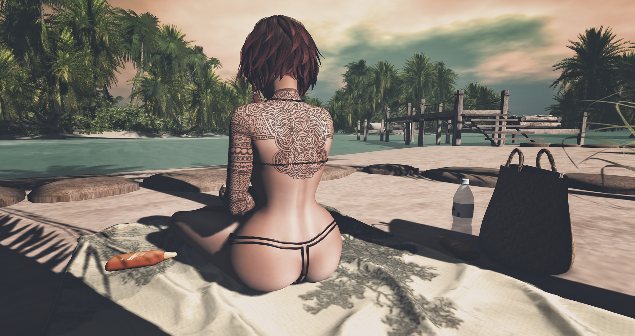 Tattoo is from White Widow and is only available as a prize for playing MadPea’s latest game Lost Treasure of the Inca Warrior. More information about the game is available at the White Widow store (linked below). It’s available in black and white and in 3 ink densities and comes with appliers for Slink, Maitreya, Adam, Eve, Belleza, TMP, Sking Brazilia and Omega appliers as well system tattoo layers.