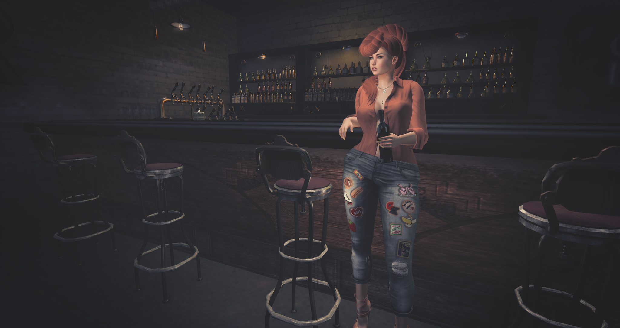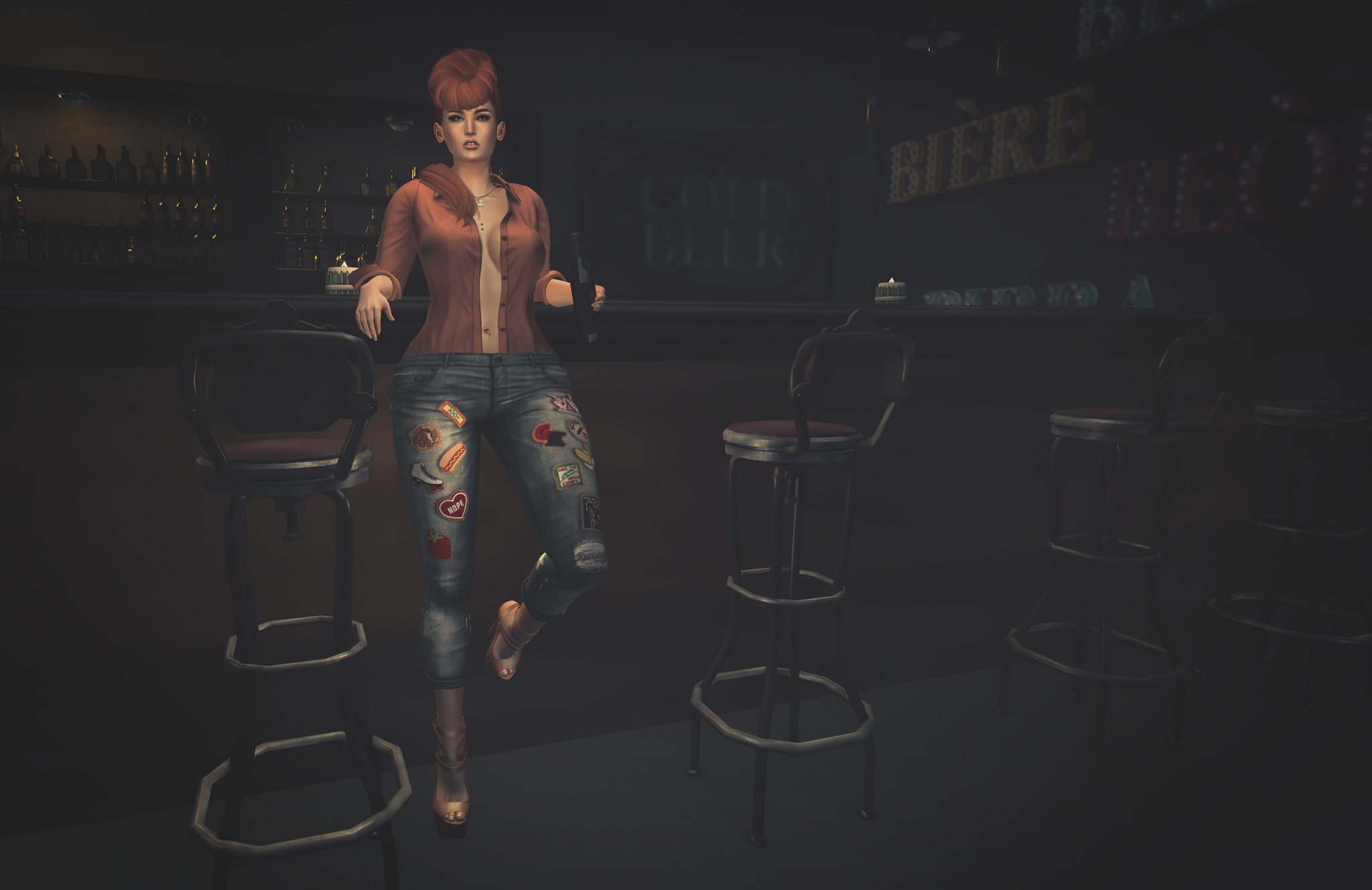 I’m wearing a two piece outfit from Ascend which is a new release at Shiny Shabby. It’s called Amina and comes with denim pants and a tucked in open shirt. Both items come in 5 standard mesh sizes, Maitreya Lara and Slink Physique and Hourglass mesh body fits. There are plain ripped pants and also some special versions available with the cartoon patches as seen in the pictures above.