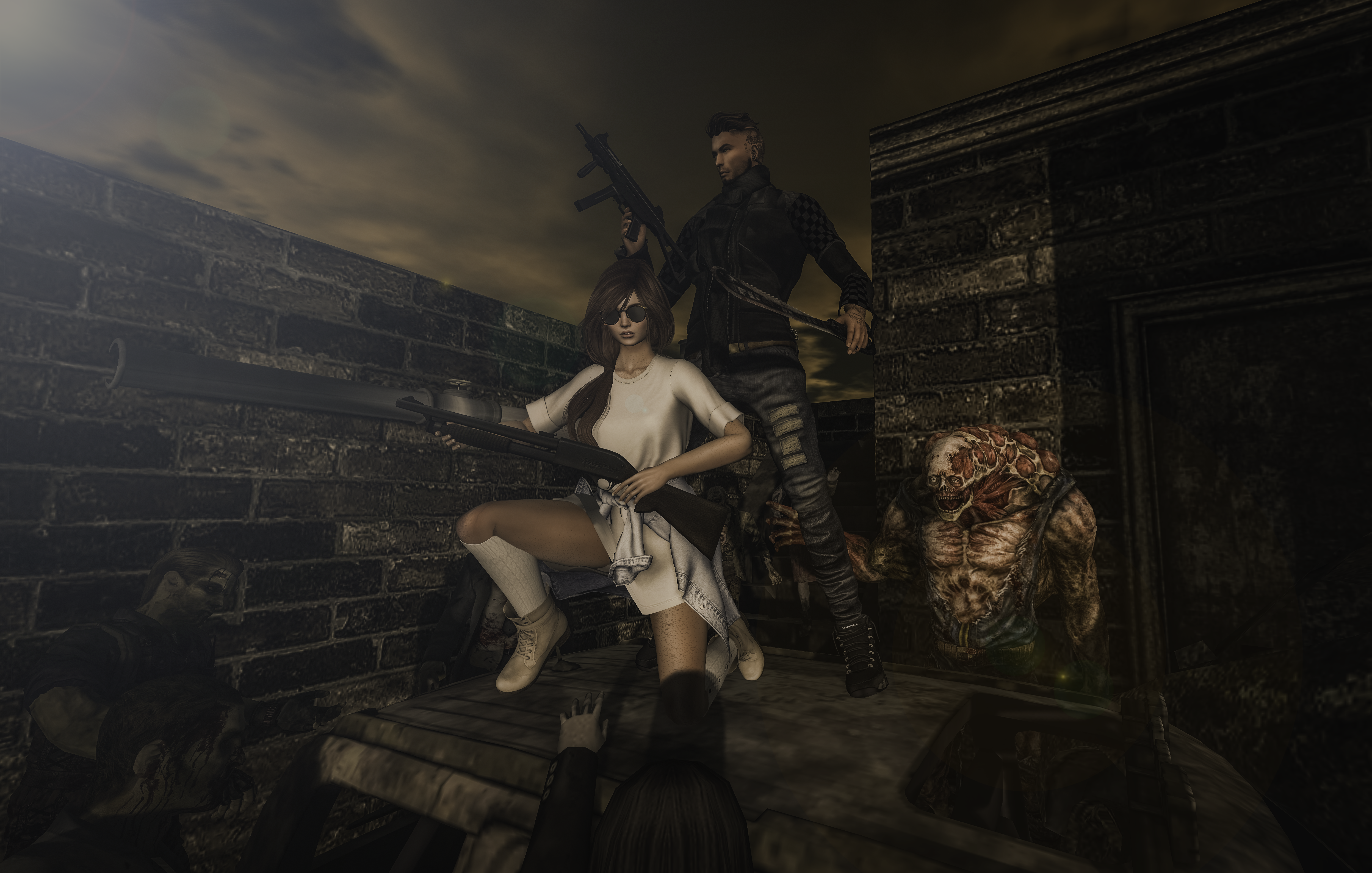 To celebrate I grabbed hold of Tackett for some Zombie killer photos on our sim yesterday. I know damn well I will be awakening tomorrow to offline skypes and facebook IM’s from him…he won’t give anything away (I know where he lives RL, he wouldn’t dare!) but there will be ‘OMG’s’ and ‘WTF’s’ a plenty no doubt