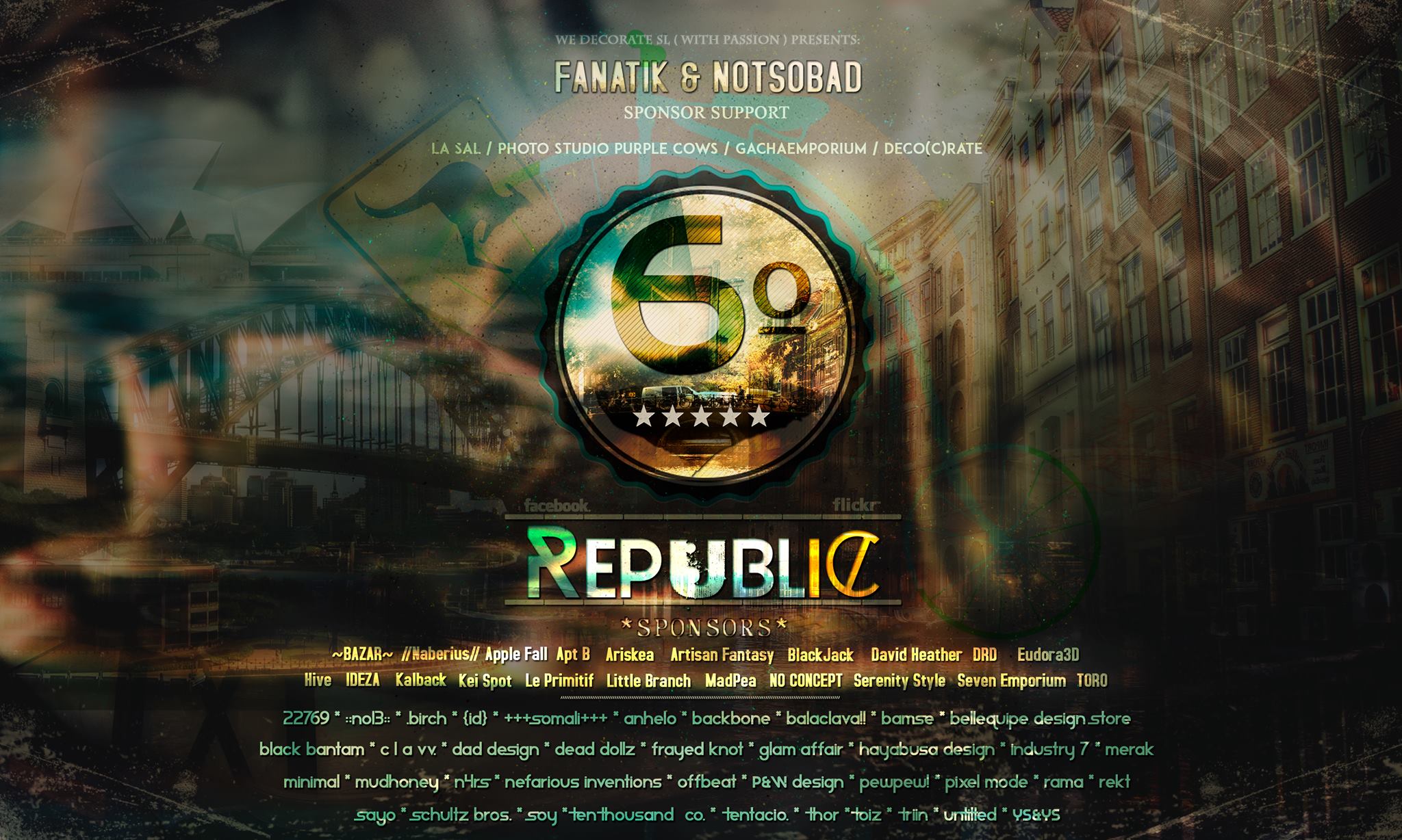 Now on to the decor. 6 Republic opens in just a few short hours and I’m super excited to see what Jay has done with the sim decoration this round. If you haven’t been before 6 Republic is a Home and Decor event which happens twice a year in November and May. The event has two geographical themes and pits them against each other. This round it’s the city of Amsterdam versus the country of Australia. Lots more items to come from me over the next week or so but as you can see there is an Amsterdam theme to my first post.