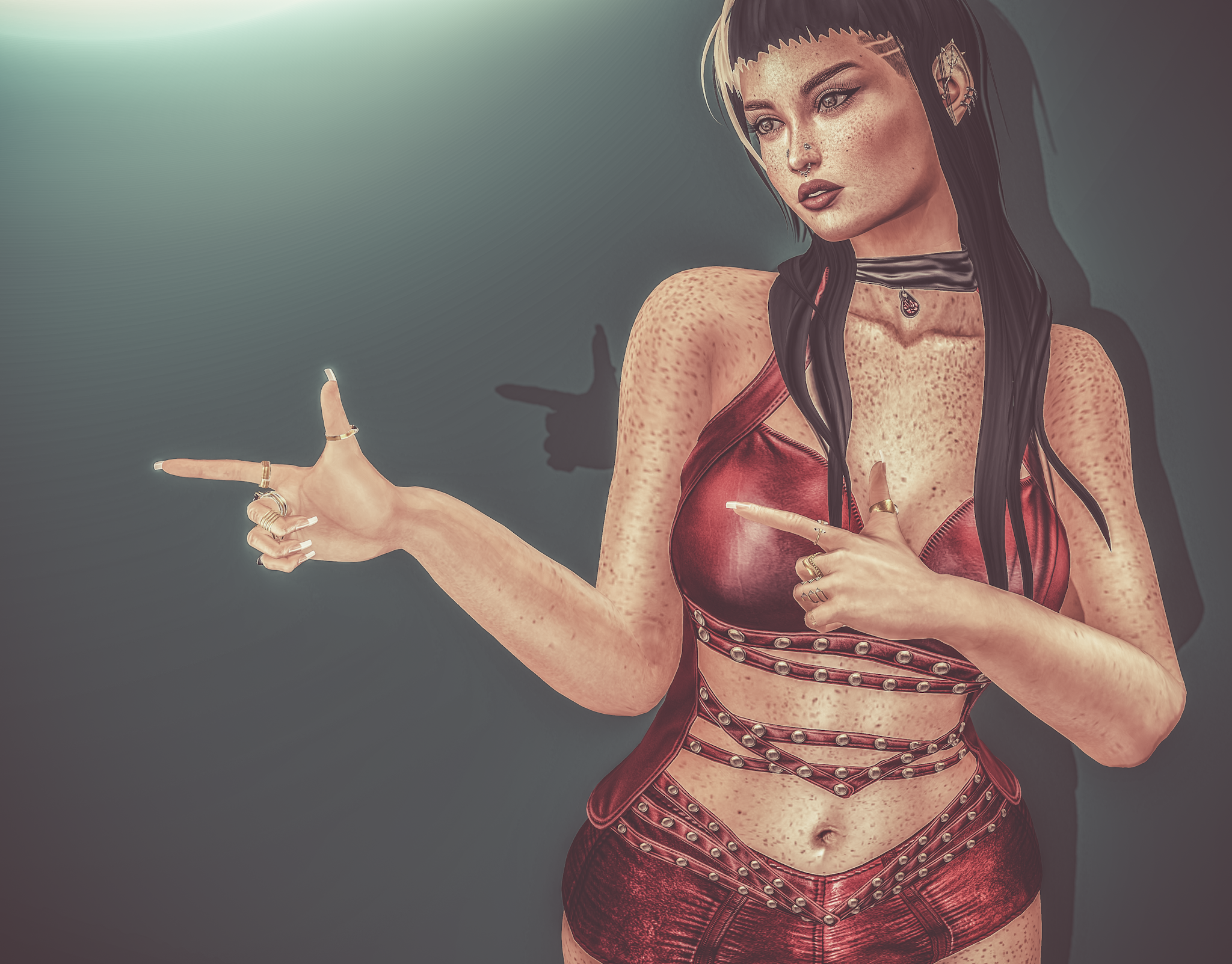 So much to talk about with lots of new items featuring in today’s picture. I’m going to come back to the Real Evil set from The Epiphany in a full post as it’s only the exclusive choker that I’m using in the picture for today. I’m wearing a brand new release from United Colors from Kinky Event which just opened. The Riley top is made to work perfectly with previous ‘Riley’ releases from United Colors and comes in fits for Belleza Freya and Isis, Slink Hourglass and Original and Maitreya Lara (worn). The back of the top has a corset style look to it with the front, as you can see, featuring straps with metal studs that can be changed via a hud.