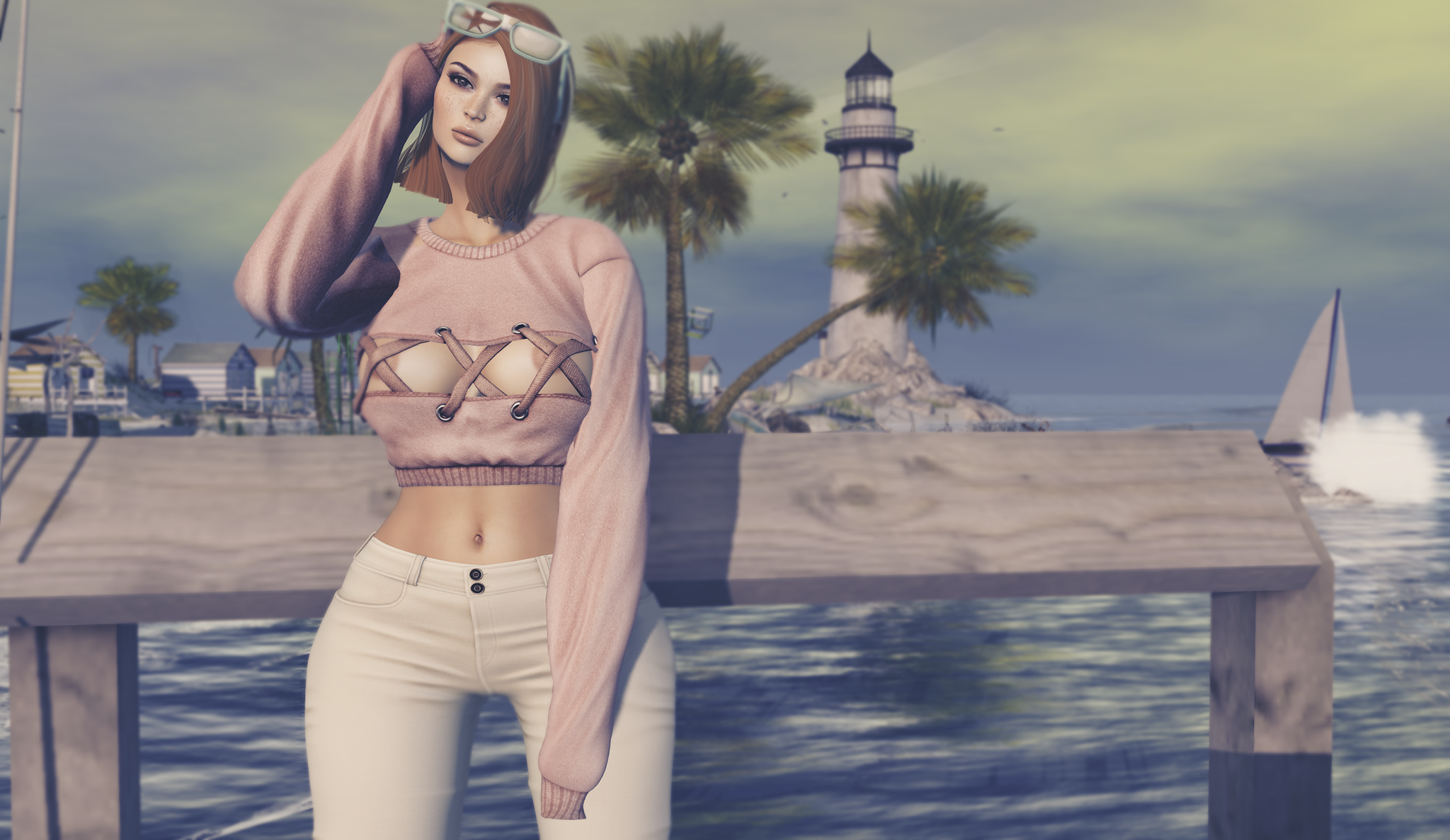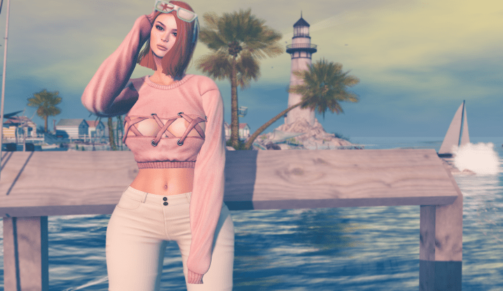 I love this new hair from Moon! It comes in two versions, with and without the Nerdeez glasses and it’s got that perfect early summer feel to it with the glasses and the hooked over the ear look on one side. The top I’m wearing is a little risque but that’s to be expected from the fabulous team at Ascend. It’s new at Mesh Body Addicts bi-monthly event and comes in a range of individual colours and colour packs and the ability to change the textures on the laces and metals. Fit wise it comes in Belleza Freya and Isis, Slink Hourglass and Original and Maitreya Lara (worn).