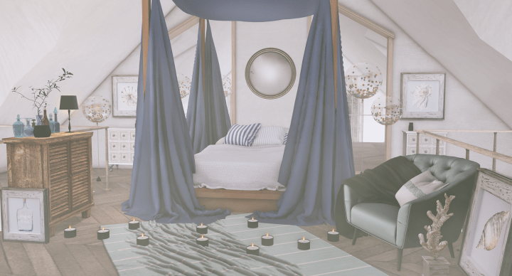 Ariskea has a collaboration with The Den that was released at the latest round of Uber. The event theme is The Hamptons, and I mentioned a couple of days ago that being a Brit, I wasn’t too sure what to expect from this theme. Having gained more of an understanding I can completely see how this set works perfectly for it. There’s a fresh, nautical feel to the set which comprises the beautiful canopy bed, shutter cabinet to the left in the photo and a range of beautiful decor artwork pieces and coral. The bed comes in adult and pg versions with 30 assorted animations and is a perfect centerpiece for any bedroom.
