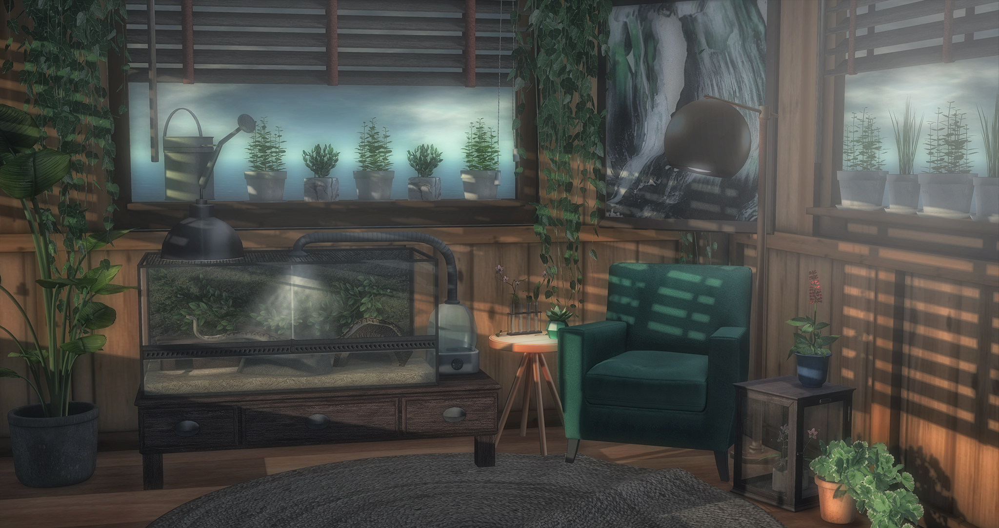 I love how green this scene is – I adore plants and flowers in Second Life and have a whole folder in my inventory just for those two things – separated out to indoor, outdoor etc.. I’ve put together this scene inside the new Caribbean Hut from Galland Homes which is available at FaMESHed and tomorrow I will be posting the outdoor shot of the building too.