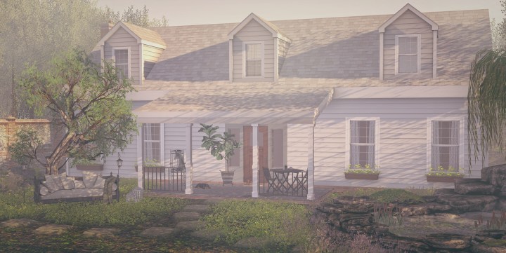 So yes, I’m a blogger. I am constantly on a platform, putting together new scenes and homes like this one today. Sometimes when I’m doing it and it comes together, like today, I feel a pang at the thought of taking it down again to build the next one. It hits you ‘I could live here….no, I WANT to live here’. That is reinforced when Zedekiah logs in while I’m working on a scene like he did yesterday and comes and looks at what I’m doing. I could totally see us sat on the porch drinking coffee in the morning or sharing an evening drink curled up on that rocking chair. I can see us playing with the dog while sprawled on the garden sofa, or feeding the koi in the pond. That’s when you know a scene is coming to life for you and becoming the difference between a home and where I log in.