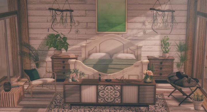 A friend of mine used to be heavily into Feng Shui, and whilst I’m not a believer that where I stick my pot plants is going to make a huge difference to my mood based on the rules of Feng Shui, I do believe that the bedroom is one of the most important rooms in the house, in terms of how rested and relaxed you are. It’s hard to relax and decompress in a room that you feel cluttered and stressed in. In real life my room is airy and light with my favourite colour palette.