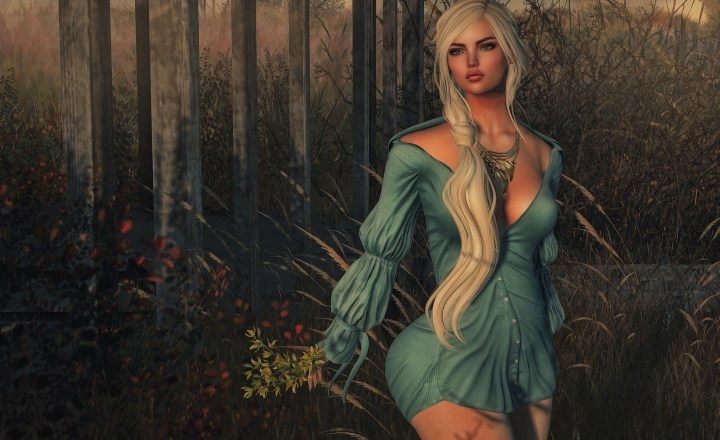 Now this got the mix about right for me as I find the Catwa heads a little too young looking for my tastes, but, Belleza skins have always had an elegance and beauty about them that is timeless. I am happy with the look but thought I’d go doubly wild and switch to blond for this shot too especially as I loved this blue pinstripe version of this shirt dress from Blueberry. Oh, and while on the subject of dresses can I get a ‘hell yeah’ for stores that build panties into ultra short skirts and dresses like this. Blueberry always does this, as does Cynful but there are some stores that do amazing dresses that are just unwearable unless you alpha your snatch or wear a panties layer, which doesn’t always work with the style of dress if it has a low back or a side split etc.