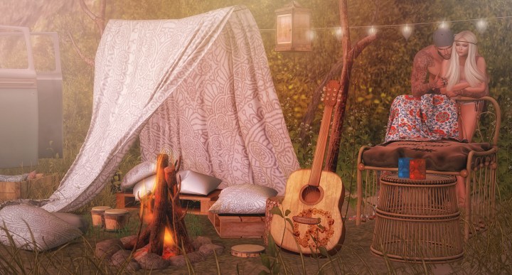 I love boho style items to wear and have around my house and sim so I was super delighted when I saw the Astralia release for Rewind event, which opens tomorrow, 15th June. The campfire set comes with adult and pg versions and to save anyone’s blushes let me tell you that Astralia has invested well in adult animations in all her items…I’m jus sayin! The camp area comes on a small mound of land and includes the fireplace, tent, the cushioned areas you can see and the guitar. There’s a texture change menu with 5 beautiful “Summer of Love” style textures and included in the pack is another rezzable and attachable guitar. There is an animation called ‘guitar’ which will auto add the guitar to your avatar but make sure you have sounds on and up so you can jam out to the guitar music you’ll hear!