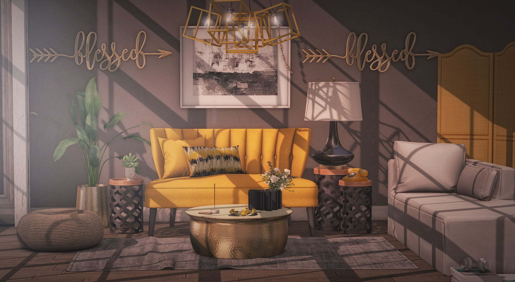 I’ve matched it up with some items from a collaboration between Fancy Decor and Commoner that is available from Uber . The set from them is a minimal style, neutral/mono style set with a sofa (not shown) and chaise as well as other smaller decor items.