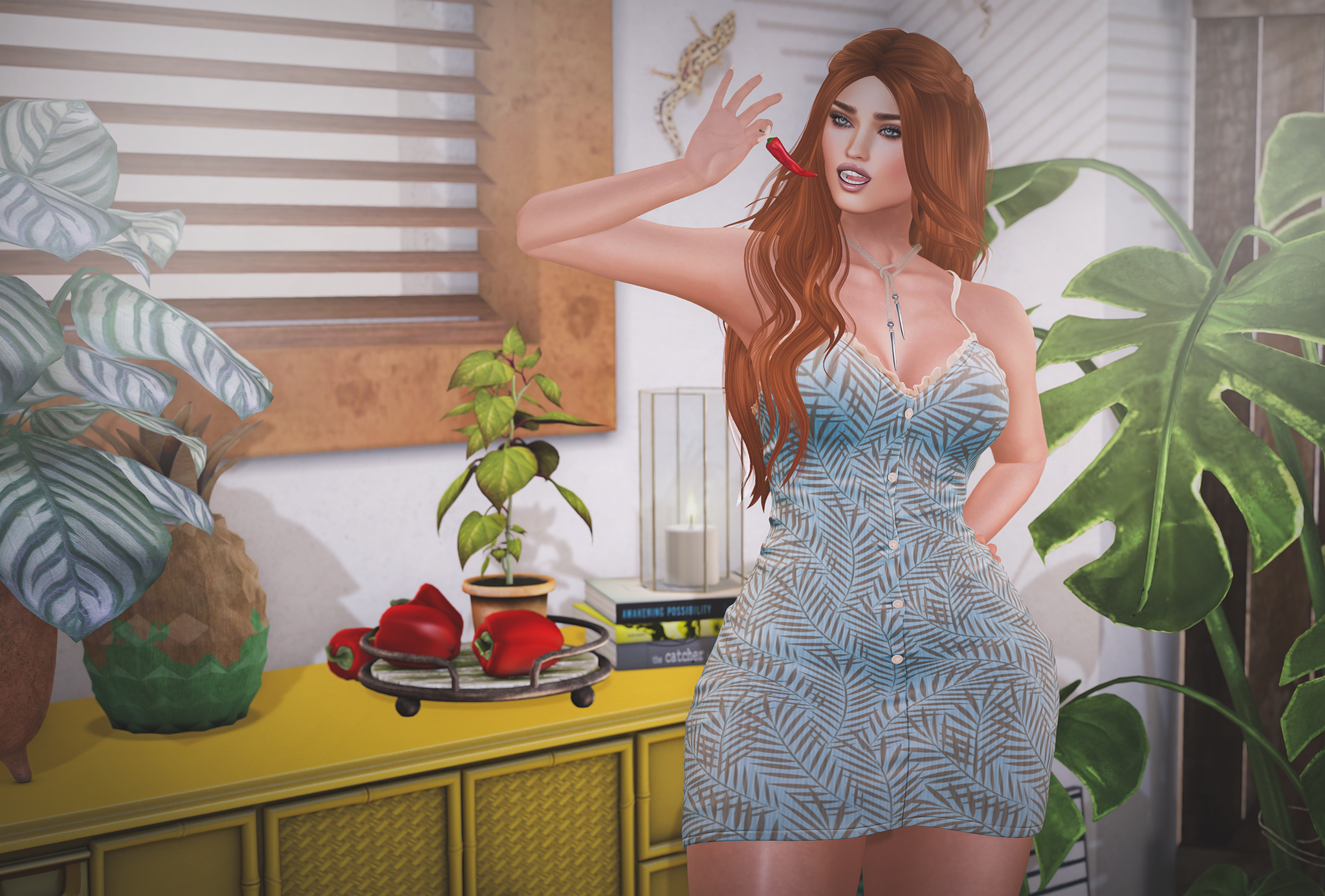 All my life I’ve been doing things I know I’m gonna regret…but I do them anyways. Sometimes for fun, sometimes for spite, sometimes because I’m bloody stubborn…apparently. In all honesty there is no way I’d eat a chilli! I don’t eat anything hot or spicy in real life…I’m totally lame when it comes to spicy food. The family likes chilli con carne, which I make occasionally but I make it super mild and then I have to let mine go cold so I can eat it as fast as possible without actually tasting it. My daughter made sweet chilli chicken on the barbecue last weekend and as it was the only thing I could eat I forced it down with a scowl on my face and a sulky pout to boot. That said these poses from SEmotion are awesome fun from Vanity event and I don’t have to complain about the taste in Second Life!