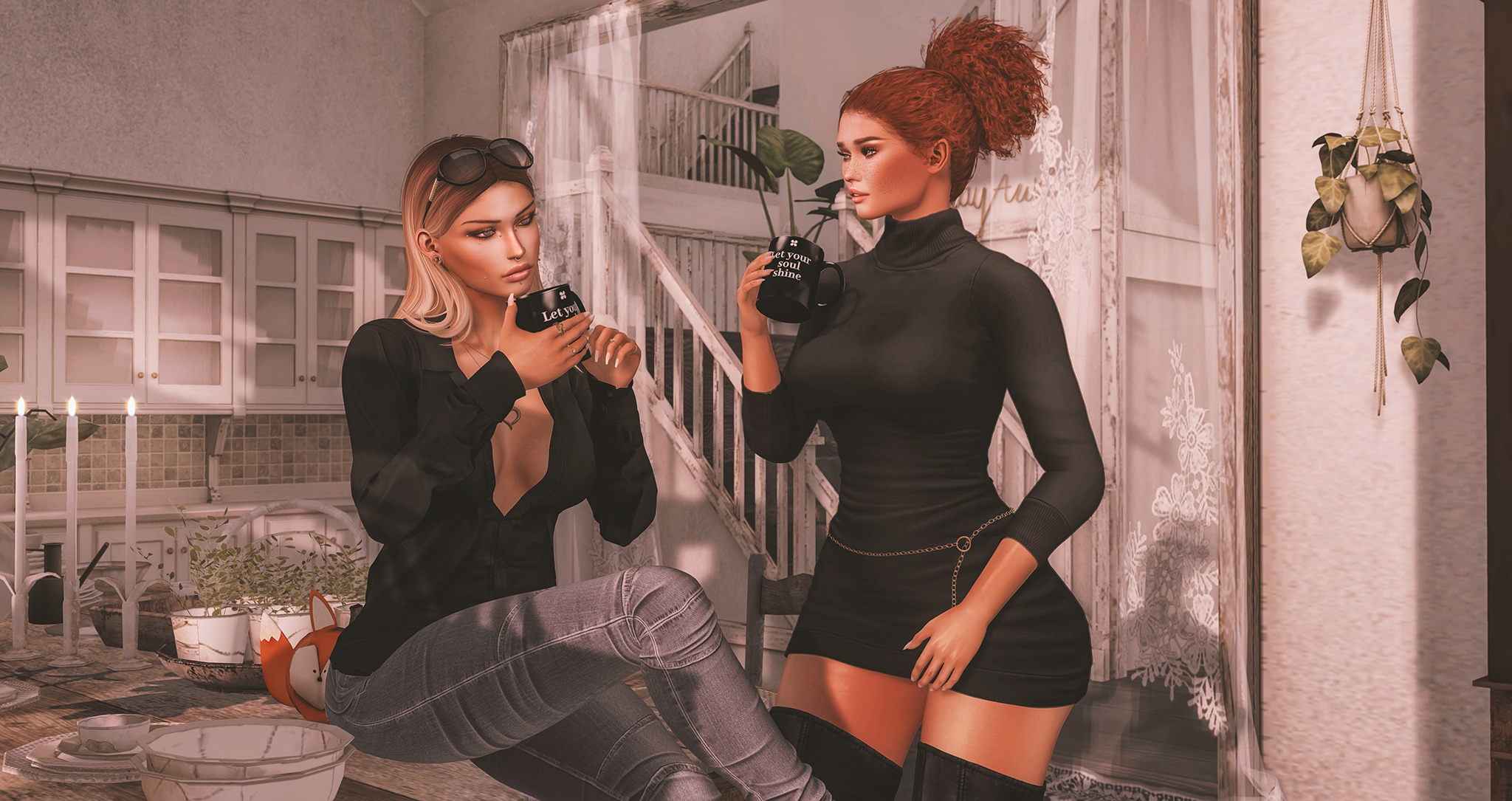 Keely and I have been toying with the idea of a collaboration for a couple of weeks now and finally we got a chance on Sunday to get together for a photo! It was a lot of fun to do especially as Sunday was the time when our other halves couldn’t get online because of the SL outtage. At least we were productive with our down time! Don’t be fooled by the coffee mugs either when Keely wasn’t looking I sneaked some vodka into both of them!