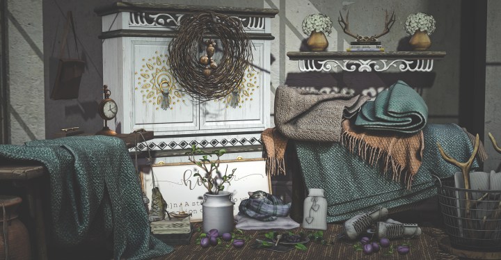 Shiny Shabby is open and as always there is a new release from Nutmeg to check out. I’m featuring a couple of the items, as well as some previous Nutmeg releases. I will be featuring more of the Dahlia release from The Epiphany too but there’s a few of their gorgeous items included in the photo too!