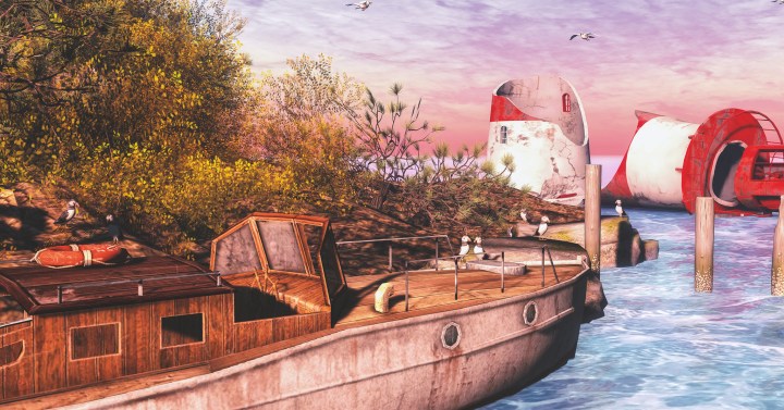 I’ve been wanting to take this photo since I saw this boat and the puffin island at the set up for Flourish. I’m not logged in SL to check at the moment but off the top of my head I believe both items are priced at only 99L$ (it’s definitely no more than that as the cap for pricing at the event is 99L$). The Puffin Island comes with the rocks and puffins but also with a separate Puffin for decor purposes.