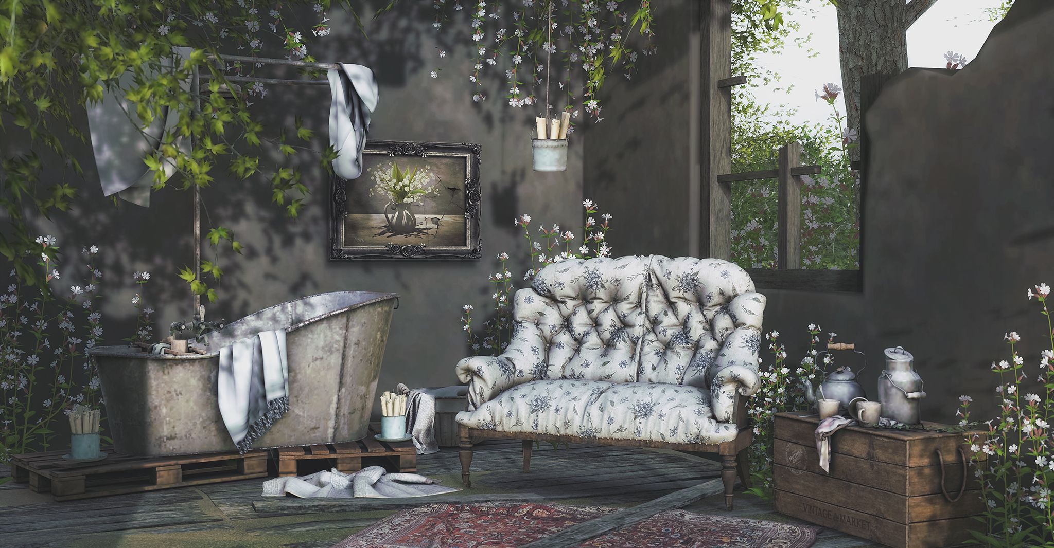 I am completely in love with the latest release from Nutmeg at the new round of Shiny Shabby. My biggest dilemma for this photograph was which of the beautiful love-seats to you but I am a sucker for this type of blue floral vintage look fabric. It’s all in the details with Nutmeg too like the bath bar and the wooden crate table with the kettle etc. Everything fits together perfectly.