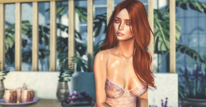 I took this pic a few days ago but am just now getting around to posting it. Mainly because I wanted to post the decor scene first, which I did yesterday. A link to the decor is below at the bottom of this post. I found the scene so relaxing and I loved the colours so it was the perfect backdrop for an avatar photo. I remembered that Narcisse had created a special mauve edition of her Lily Slip dress for Flourish and figured it would work perfectly for the scene too!