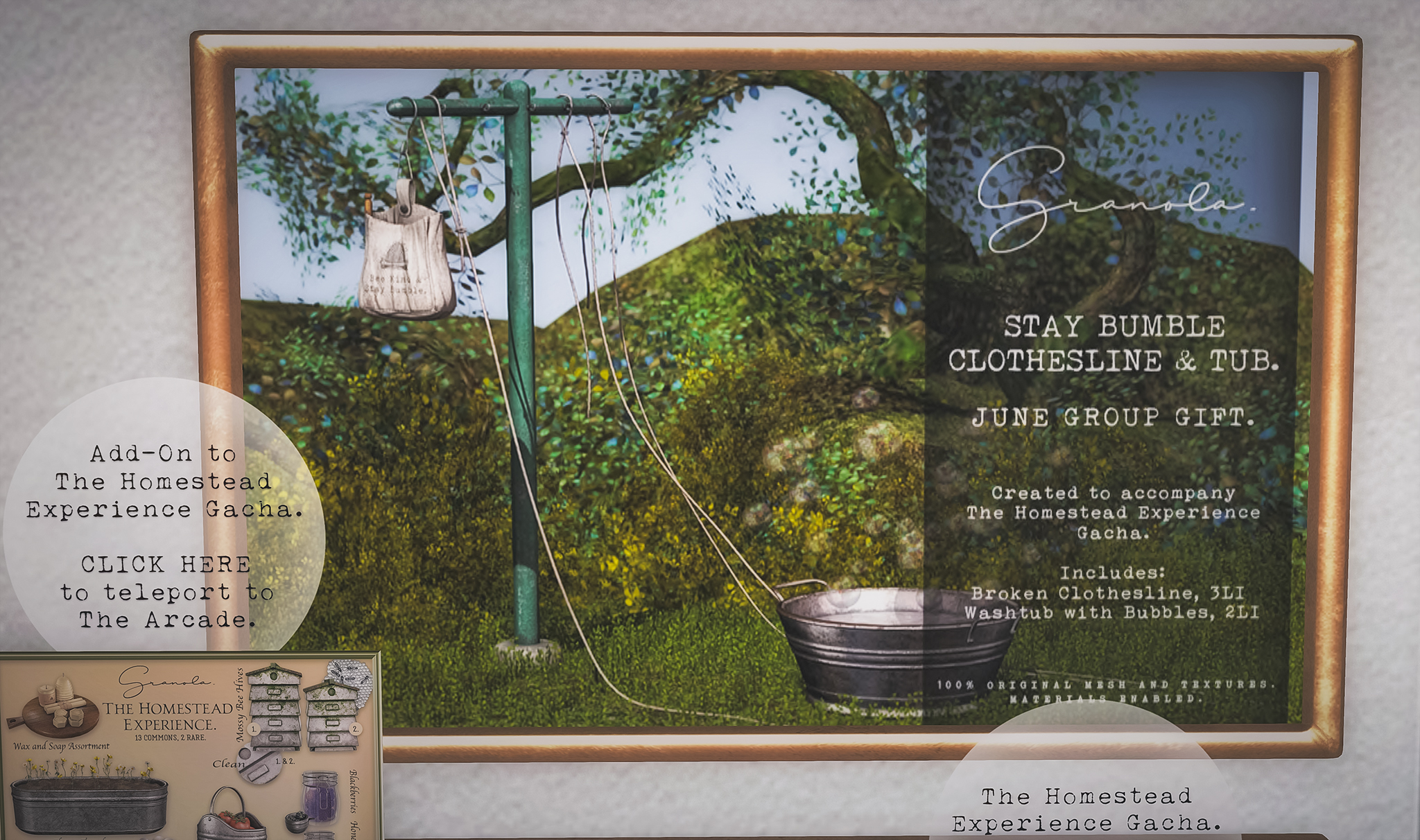 Here’s a shot of the current group gift which perfectly matches the latest release, The Homestead Experience Gacha available now at The Arcade.