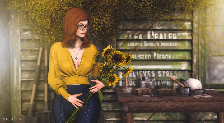 There is still plenty of time to head over to Collabor88’s March round and the garden party theme this round gave us some beautiful items. Today I’m featuring as decor the Sari-Sari Potting Table set and matching that up with an outfit inspired by sunflowers. I love this time of year and those that follow the blog know I love the colour yellow! So this felt like a perfect combination. The sweater is by Pixicat and I’m wearing the Legacy size. The pants are from The Secret Store and I am wearing Maitreya sizing with deformers for Legacy. The stunning shoulder length cut is from Tableau Vivant and skin and cosmetics, as always, by Glam Affair.