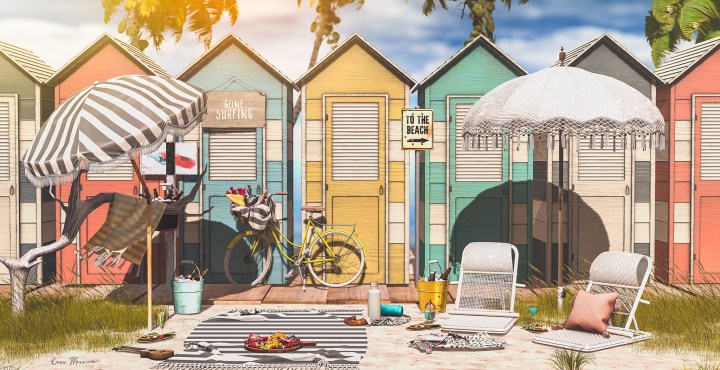 The Summer season also lends itself to my favourite photographic style of high vibrancy, colourful, sun-filled photos. I had been planning to do a photograph with the items from the Merak gacha from The Arcade and my plan for that photo went out the window somewhat when I saw so many of the incredible decor items at Summerfest. These THOR beach huts are just perfect as the backdrop for the scene which includes items from a lot of my favourite stores including Granola! So, grab a cocktail, pull on some shades and dive into the super Summer items on display today.