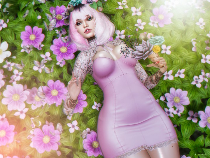 I am wearing the latest release from Dead Doll which is available at Cupid Inc event. It’s a gorgeous fitted short dress with a lace piece fitting over the arms and shoulders, with a nice high neck and tie. It’s rigged for Reborn Juicy (worn), Maitreya, Maitreya Petite, Nerido push-up and Legacy.