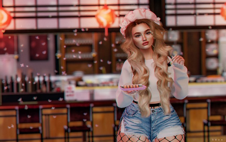 *Outfit – Blueberry – Mia – Cropped Sweater, Jean Shorts + Fishnets